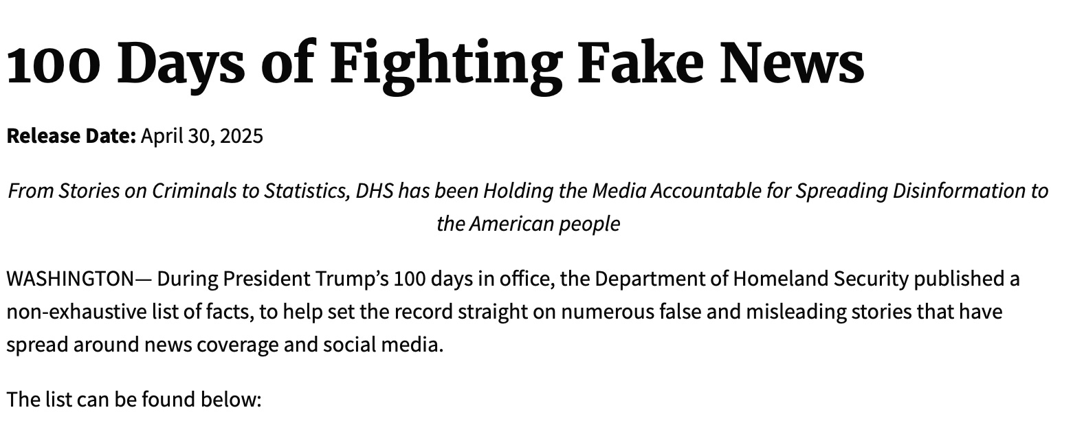 On the official website of the United States Government, an article entitled “100 Days of Fighting Fake News.”