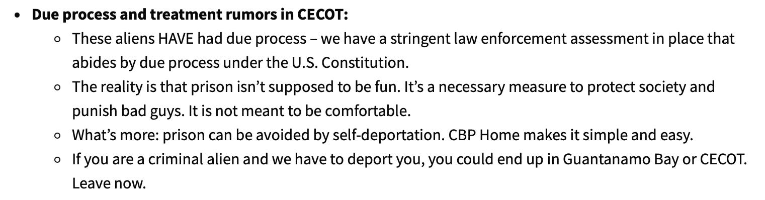 An excerpt from a subsection entitled Other Fake News Narratives Corrected addressing public concern about individuals deported without due process to Centro Del Confinamiento del Terrorismo (CECOT) in El Salvador: